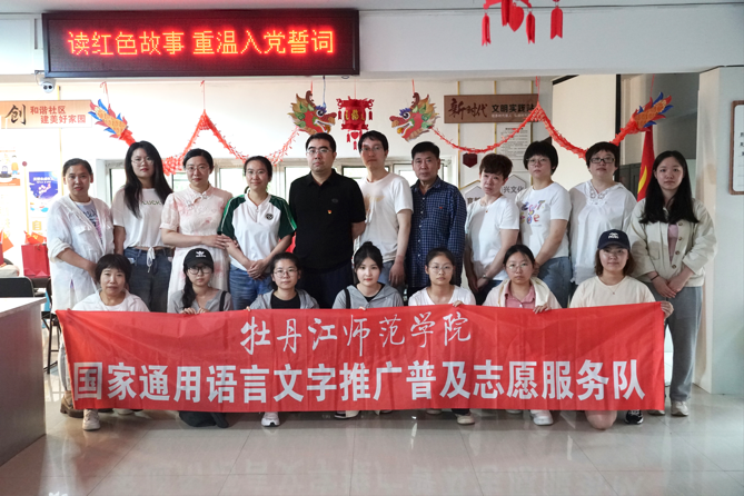 为推广普及国家通用语言文字,进一步提高社区居民普通话水平,强化社区居民的语言规范意识,牡丹江师范学院文学院语言文字志愿服务队于6月26日下午两点半走进园明社区,开展了以“迎红色七一,讲红色故事”为主题的语言文字推广活动。