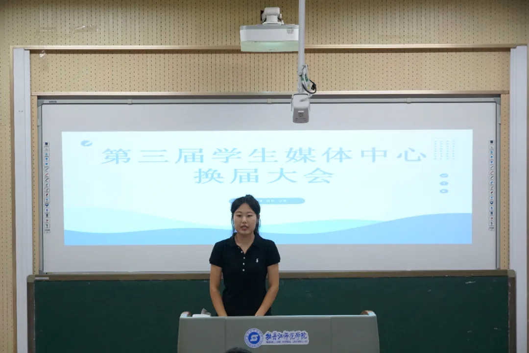 会议第二项议程,指导老师张东影发言,并为第二届学媒主任团、部长、副部长颁发聘书。她对第二届学生媒体中心全体成员夜以继日的努力表示充分肯定,希望下一届学生媒体中心成员能够勇担重任,接过前辈的接力棒,继续发扬学生媒体中心的优良传统,以更饱满的热情投入到工作当中。