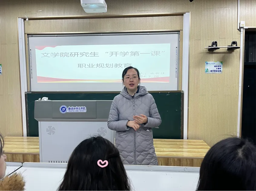 研究生“开学第一课”职业规划教育由施新佳副院长主讲。施院长对新学期研究生工作进行了部署安排,要求同学们尽快调整状态投入到新学期的学习、科研、创作中,做好学习规划和就业规划。施院长鼓励大家积极参与科技创新项目,增加知识储备,提高学术能力,在按时完成学业的同时,提早树立清晰的就业目标,并有针对性的朝着目标努力。施新佳院长与参会同学针对师范协同提质联合培养进行了热烈探讨和答疑,鼓励同学们在研究生期间珍惜学术时光,用功、用心、用力多出科研成果,积极参加大学生创新创业大赛,争取取得好成绩。