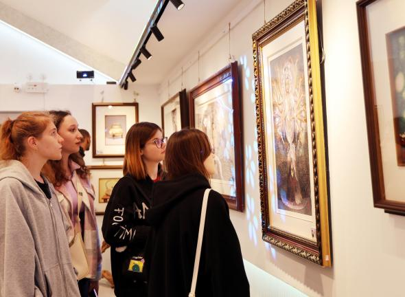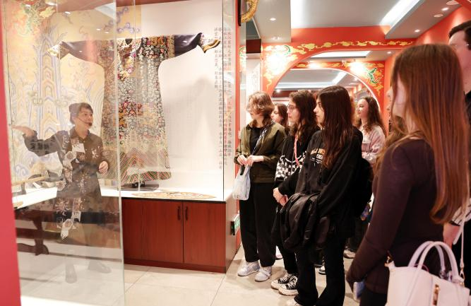 在满绣艺术馆,留学生通过全息投影、虚拟现实等技术,了解满绣从渤海靺鞨绣到现代艺术品的演变历程,欣赏了满绣历史文物及当代设计师的创新作品。在满绣传承人的指导下,留学生尝试用满绣针法绣制了“少女与和平鸽”主题的作品,亲身体验了这一国家级非遗技艺。
