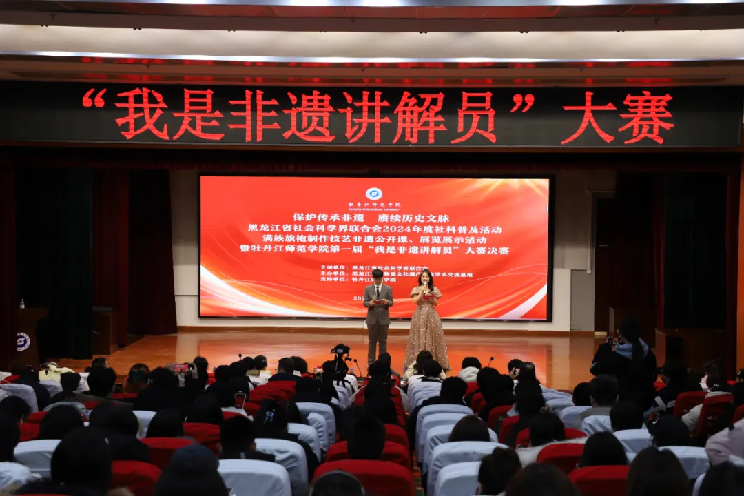 活动的第二项内容是牡丹江师范学院第一届“我是非遗讲解员”大赛决赛。本次大赛全校研究生、本科生积极响应、踊跃参与,12月5日进行了大赛初赛,择优选拔20名选手进入决赛。20名参赛选手所讲解的内容均为入选国家、省、市、县四级非遗名录的项目,讲解内容涵盖广泛,包括满族说部、北票民间故事、英歌(潮阳英歌)、七江炭花舞、东北二人转、望都传统木工技艺(榫卯结构技术)、赫哲族鱼皮制作技艺、龙麟装技艺、重庆火锅、秋林大面包(大列巴)制作技艺、琉璃烧制技艺、炭烤牛肉干制作技艺、壮族织锦技艺、满族歘嘎拉哈、太极拳(陈氏太极拳)、苏绣、麦秸工艺(秸秆画技艺)、朝鲜族服饰、女书习俗、蟳埔女习俗等,涉及民间文学、传统舞蹈、曲艺、传统技艺、传统体育、游艺与杂技、传统美术、民俗等多个类别。选题视角也丰富多样,从自身民族文化视角选题,从自身家乡文化视角选题,从自身兴趣爱好视角选题,更多学生从龙江特色文化视角选题,充分展现了大学生对于中华优秀传统文化的热爱和保护传承文化的意识。