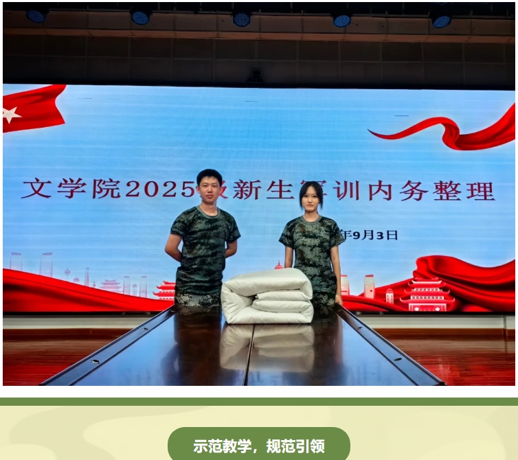 金秋九月,迷彩飞扬。为强化军训育人实效,培养新时代大学生纪律意识和优良作风,9月3日,文学院以“砥砺青春 规范先行”为主题,组织2025级全体新生开展军训内务整理培训活动,通过“方寸之间见真章”的实践教育,为新生扣好大学生活的第一粒扣子。